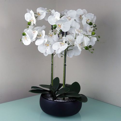 Realistic 60cm White Orchid in Elegant Black Ceramic Planter - Ready to Display!